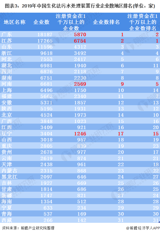 值得注意的是,排名第一的廣東省共有18187家新成立企業(yè),但是它的注冊(cè)資金在1千萬以上的企業(yè)數(shù)(5870家)卻不如排名第二的江蘇省(6754家)。因此,可以看出雖然廣東省有18187家企業(yè)但是江蘇省(17265家)才是中國(guó)生化法污水處理裝置行業(yè)主要集中地。此外,河南省和遼寧省也是同樣的情況,雖然企業(yè)數(shù)排名較后,但是其注冊(cè)資金在1千萬以上的企業(yè)數(shù)排名卻比新成立企業(yè)數(shù)排名較為靠前。