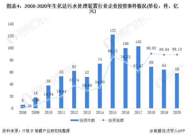 根據(jù)it桔子的數(shù)據(jù)顯示,2008-2020年生化法污水處理裝置行業(yè)企業(yè)投資事件呈現(xiàn)波動(dòng)趨勢(shì)。在2015年,生化法污水處理裝置行業(yè)企業(yè)投資事件達(dá)到近年來峰值122件,但投資金額為86.12億元。從投資金額角度來看,在2018年,生化法污水處理裝置行業(yè)企業(yè)投資達(dá)到了近年來峰值90.92億元。