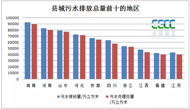 從省份來看,大部分省市數據顯示的縣城污水排放總量和處理總量之間缺口不大,達到95%以上,處理能力仍存在一定缺口的主要是西藏、海南、青海等省市。