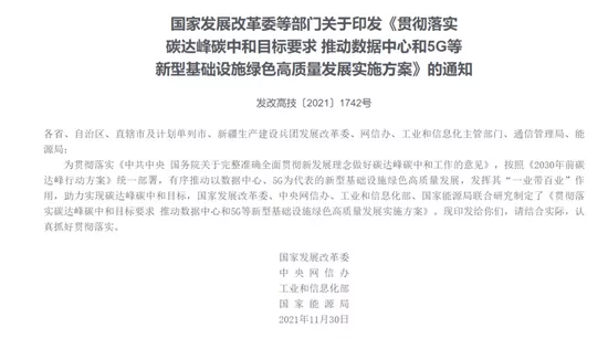 12月8日,國家發改委等四部分印發《貫徹執行碳達峰碳中和方針要求推進數據中心和5g等新型根底設施綠色高質量展開實施計劃》。《計劃》提出,到2025年,數據中心和5g根本形成綠色集約的一體化運轉格局。