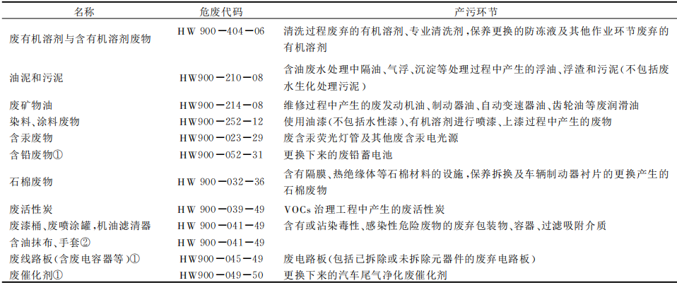 汽車維修過程產(chǎn)生的固體廢物包括一般工業(yè)固廢、危險(xiǎn)固廢和生活垃圾三類。一般工業(yè)固廢有碎玻璃、廢塑料、廢輪胎、廢鋰電池等,對照《國家危險(xiǎn)廢物名錄(2021年版)》,危險(xiǎn)廢物共涉及8類12種(表1),其中廢礦物油、廢鉛蓄電池約占危險(xiǎn)廢物總量的90%。